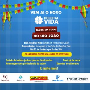 Chegou o mês do São João!!!! E para não deixar passar em branco esse momento tão importante para a tradição nordestina e nossas raízes, realizaremos no dia 22 de Junho, a live “ Hospital Vida: Saúde em foco no São João”. Teremos homenagens aos profissionais da saúde e às vítimas da covid, mensagens de médicos,...