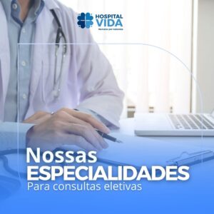 O Hospital Vida modernizou o atendimento e oferece agendamento de consultas e exames totalmente eletrônico. A mudança veio para facilitar o acesso aos especialistas e exames oferecidos pelo HV. Veja abaixo as especialidades que contam com médicos para consultas no centro de especialidades médicas: Angiologia Bucomaxilofacial Cardiologia Cirurgia Geral Clínica médica Dermatologia Endocrinologia Gastroenterologia Ginecologia...